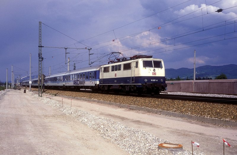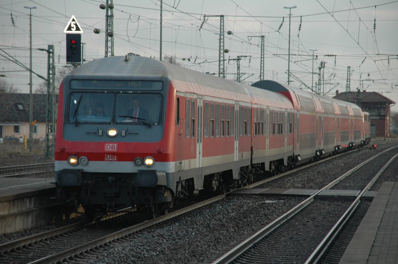 Die 111 035 mit einem RE am 13.04.2009 bei der Durchfahrt am Heimeranplatz (München)