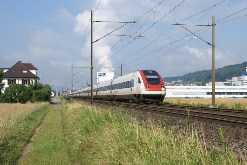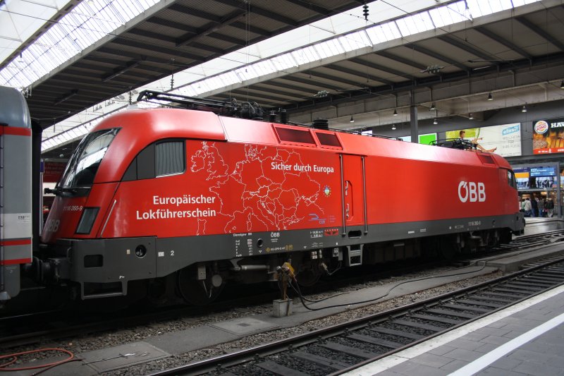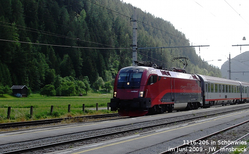 1116-206 durchmißt mit ihrem Eurocity Schönwies auf dem Wege nach Osten, wo sich morgens die Sonne mit himmlischem Fernlicht aus dem Dunkel der Nacht erhebt gleich einer mächtigen Lok am Firmament. Im Juni 2009 kHds