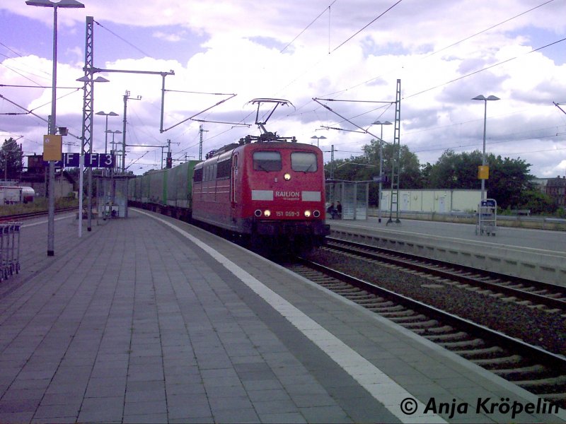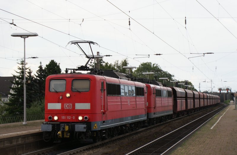 151 112-0 in Doppeltraktion mit 151 167-4 bei der Durchfahrt des Celler Bahnhofes auf Gleis 6,mit einem leeren Kohlezug am 19.07.2009.