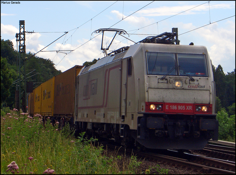 186 905 XR der Crossrail mit einem Gz Richtung Mönchengladbach, vmtl. nach Köln als Umleiter kurz vor dem Bf Übach-Palenberg 17.7.2009