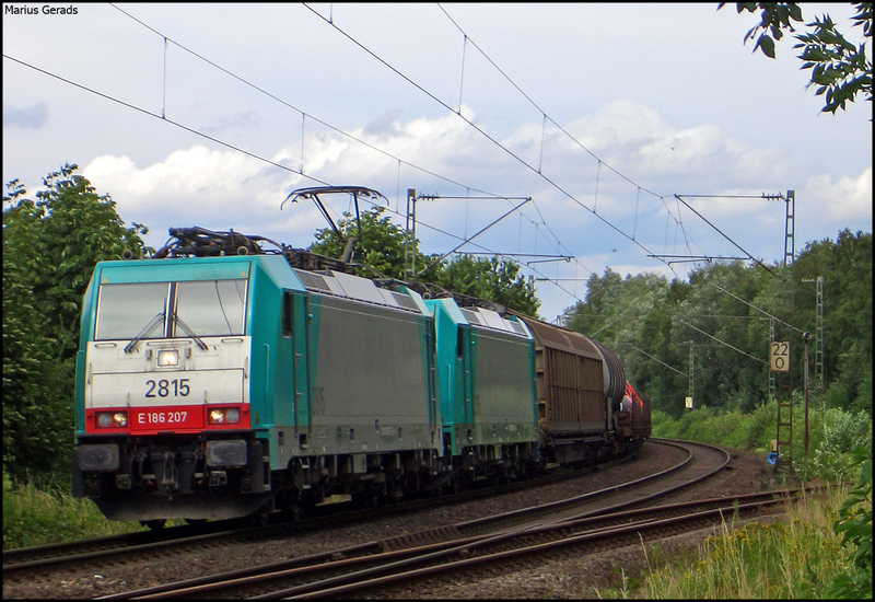 2815 und 2816 mit einem Gz gen Aachen-West und weiter nach Montzen am Km 22.0 kurz hinter dem Bf Übach-Palenberg 17.7.2009