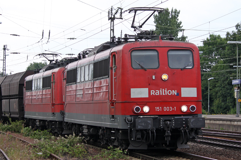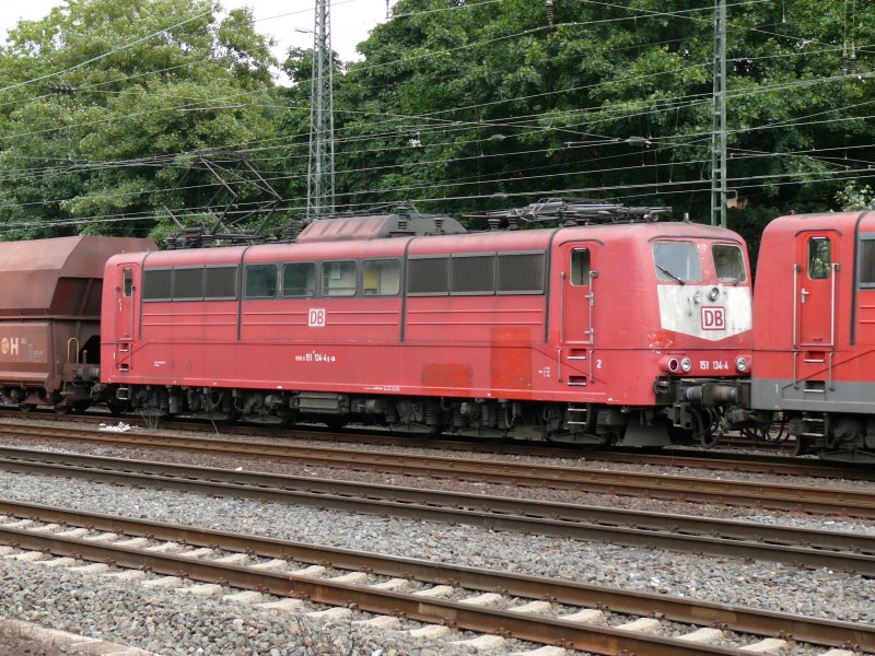 Die sichtlich schon arg mitgenommene 151 134-4 mit Lätzchen in orientrot befand sich als zweite Lok in diesem Güterzug, der am 18/07/2009 durch Köln-West fuhr.