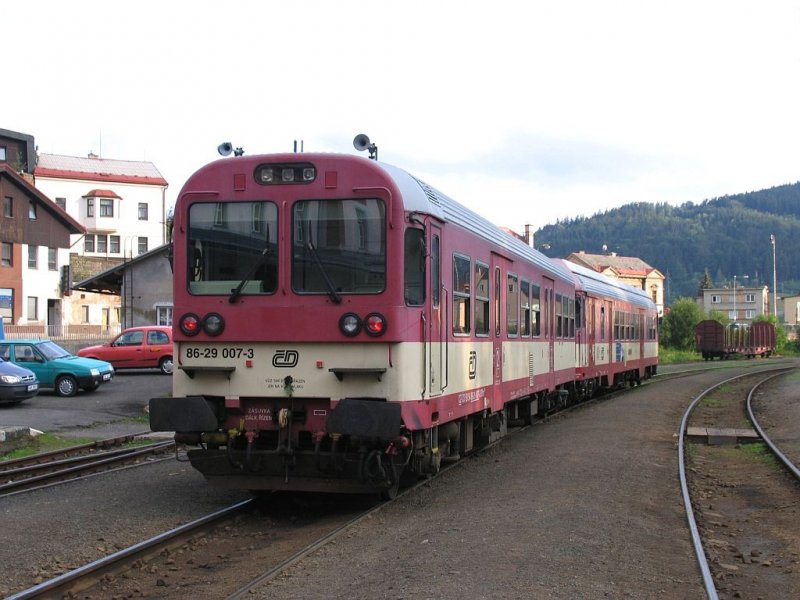 Die andere Seit von dem Triebwagen: die neue Steuerwagen 86-29 007-3 und Motorwagen 843 007-6 mit Ersatzzug Sp 17246 Tanvald-Dresden Hbf auf Bahnhof Tanvald am 11-7-2009. Diese Steuerwagens machen das Umlaufen am Endpunkt unnötig.