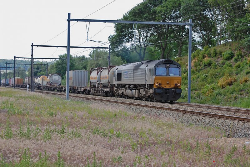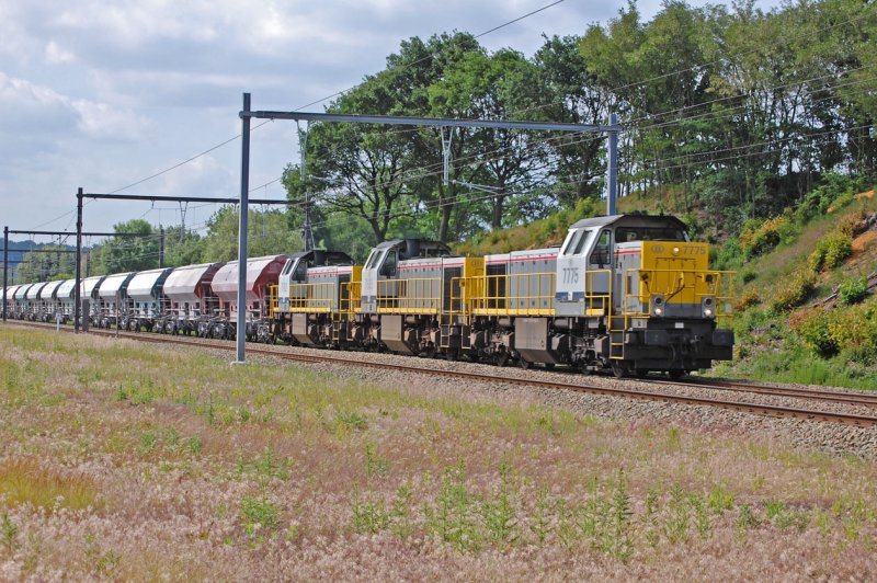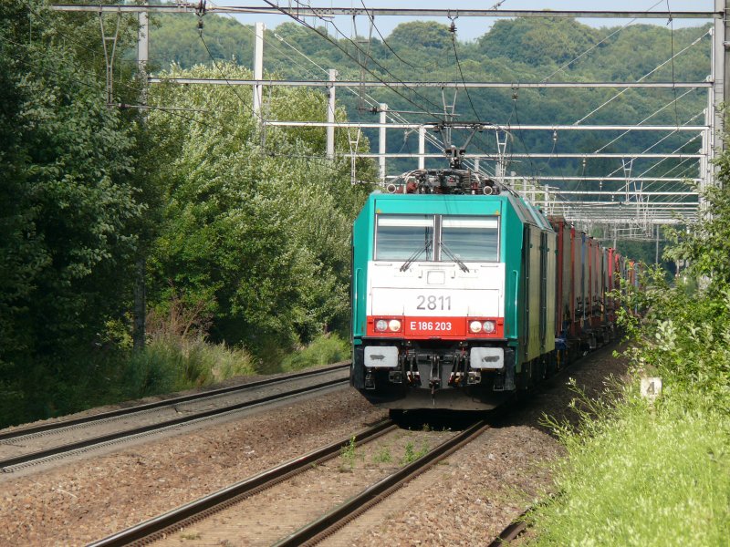 Die fehlte noch in meiner Sammlung. 2811 kommt mit einem Containerzug aus Aachen-West. Hinter ihr hängt noch die abgebügelte 2841. Aufgenommen am 19/07/2009 bei Warsage.