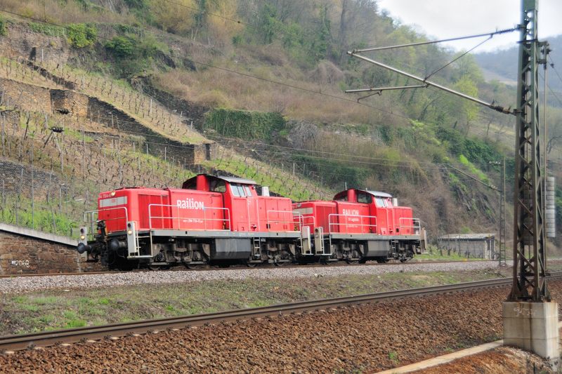 Doppel-Diesel: 294 724-0 und 294 872-7 streben nordwärts und werden gleich die Loreley unterfahren. (KBS 466, Ende April 2009).