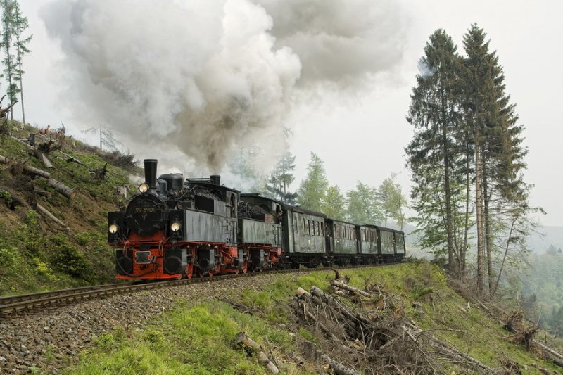 Im leichten Nebel sind die beiden Mallets hier auf dem Weg zum Brocken. (Frühjahr 2009)