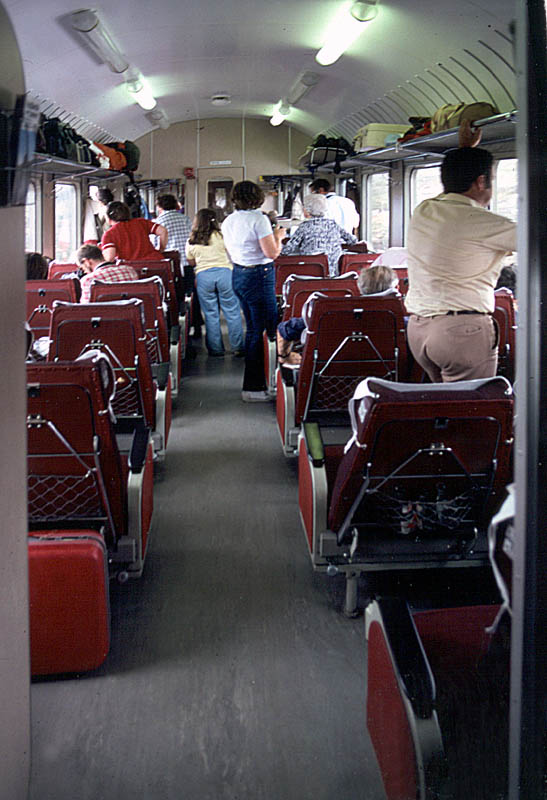 Im NSB-Zug unterwegs zwischen Trondheim und Bodø im normalen Sitzplatz-Wagen. Die Fahrt dauerte rund 12 Stunden. Juli 1982, Scan ab Dia.