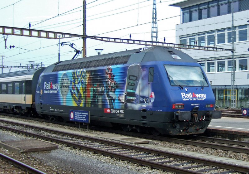 SBB: Eine Werbung für RailAway trägt zurzeit die Re 460 005 "Val d`Anniyiers". (Langenthal, 16.7.09)