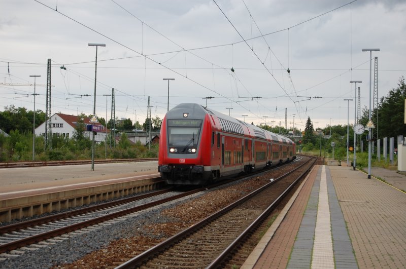 Seit gut einem Jahr verkehren auf der Neckar-Alb-Bahn die neuen Doppelstockwagen der 3. Generation. Am 18.7.2009 konnte ich einen aus diesen Wagen gebildeten Zug als RE nach Tübingen in Reutlingen bildlich festhalten. Im Schub eine Lok der BR 143.