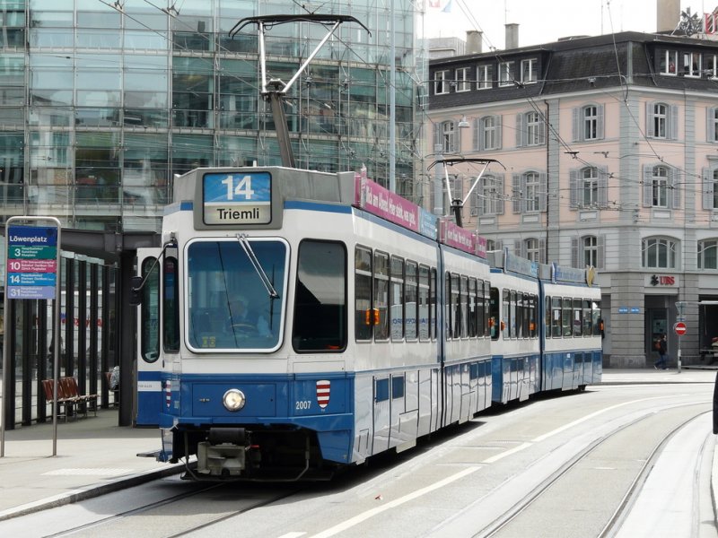 VBZ - Tram Be 4/6 2007 zusammen mit einem Be 4/6 unterwegs auf der Linie 14 in der Stadt Zürich am 06.05.2009