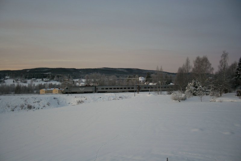 X2000 Triebzug auf der Fahrt duch das Ljungantal am Morgen des 27.12.2008 bei Torpshammar.