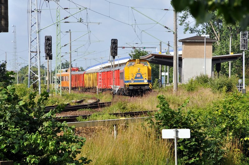 "Dieter" ist am tuen 203 301 mit einem Unkrautspritzzug unterwegs von Stralsund nach Rostock, hier bei Starkow am 15.07.09
