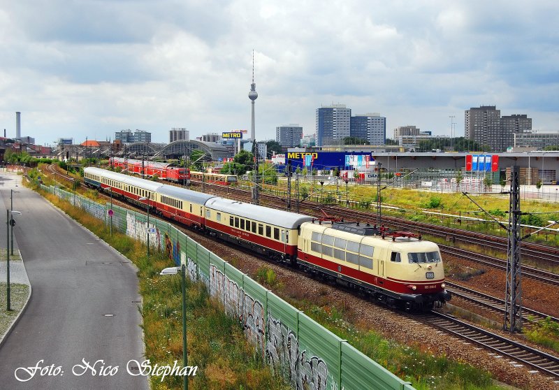 103 235-8 passiert mit DPE 91341 Köln Hbf. - Poznan die Berlin-Kulisse an der Warschauer Str. (11.07.09)