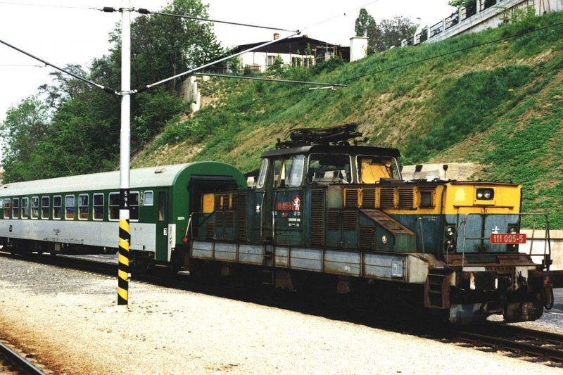 111 005-5 auf Bahnhof Praha-Hlavni am 8-5-1995. Bild und scan: Date Jan de Vries.