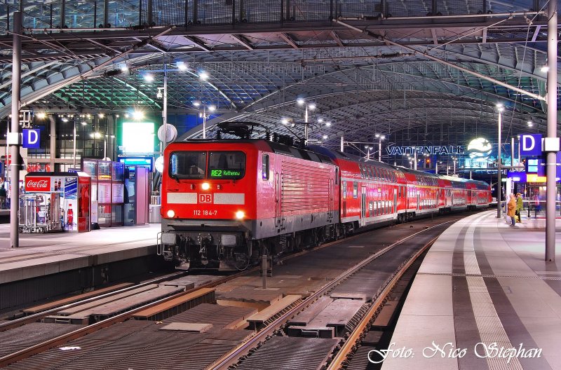 112 184-7 mit RE 38148 Cottbus Hbf. - Rathenow im abendlichen Berliner Hbf. (12.07.09)