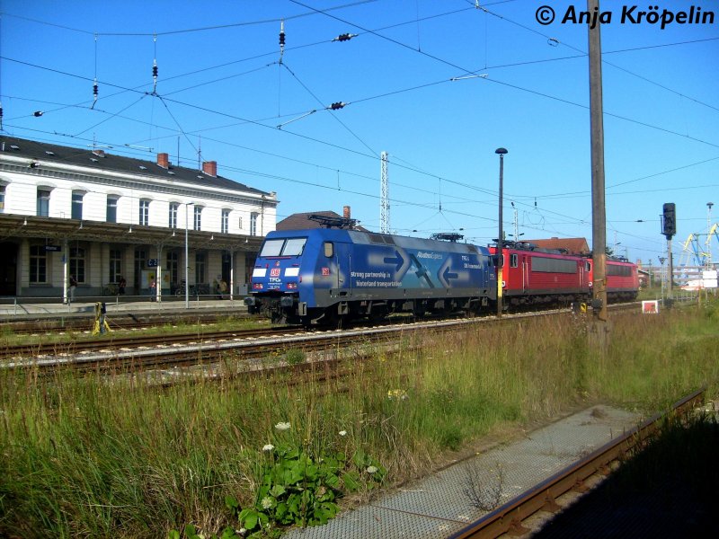 203 311-6 mit Hilfszugwagen im Hbf Stralsund. (Der Zug ging weiter auf die Insel Rügen) am 10.07.09