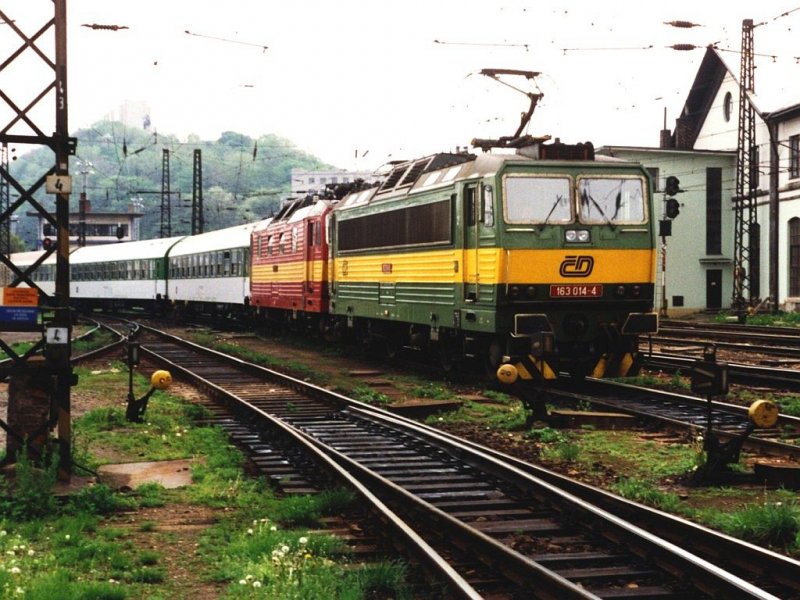 163 014-4 und 372 013-5 mit Zug Decin-Praha-Masarykovo auf Bahnhof Praha-Masarykovo am 8-5-1995. Bild und scan: Date Jan de Vries.