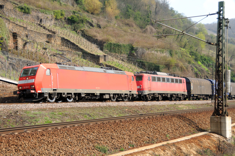 185 155-9 und 140 653-7 als Wagenlok mit einem gemischten Güterzug kurz vor Einfahrt in den Loreley-Tunnel. (April 2009).