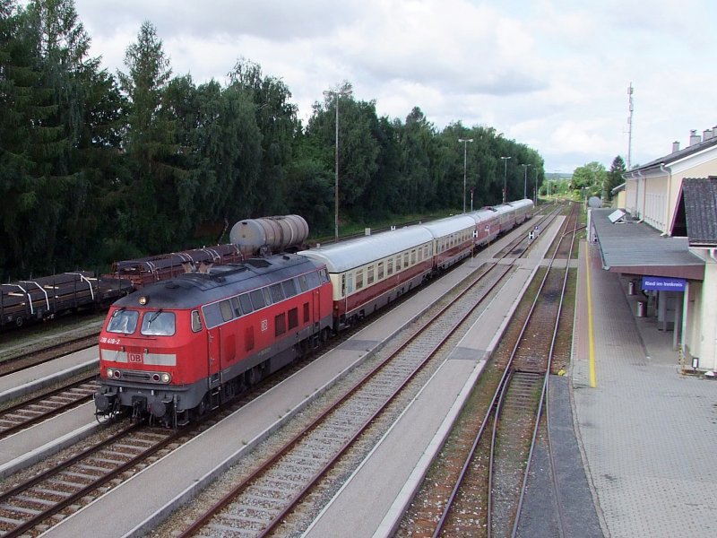 218 418-2 durchfährt mit D16433(1.Klasse Nostalgiezug TEE Rheingold)den Bhf. Ried i.I. Richtung Linz/Donau;090725