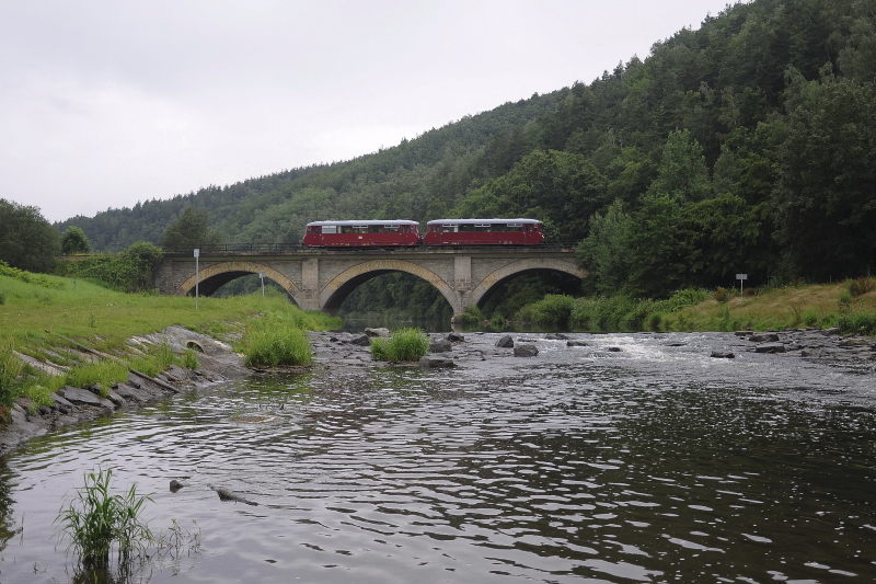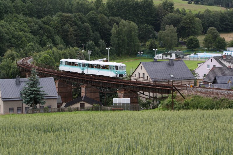 Am zweiten Fahrtag des 3. Fahrtenwochenendes der Erzgebirgischen Aussichtsbahn (EAB) überquert 772 312-5 mit 772 367-9 die Schwimbadbrücke in Markersbach. (12.07.09)