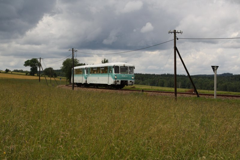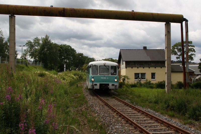 Am zweiten Fahrtag des 3. Fahrtenwochenende der Erzgebirgischen Aussichtsbahn fährt 772 312-5 mit 772 367-9 in den ehemaligen Bahnhof Scheibenberg in Richtung Annaberg Buchholz. (12.07.09)