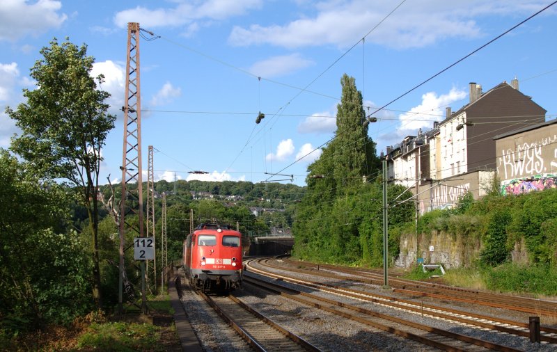 Bügelfalte 110 417-3 zieht am 24.07.2009 ihre RB48 in Nähe Zoo durch Wuppertal. Die Fahrt hat erst vor 2-3 Minuten im Wuppertaler Hbf begonnen.