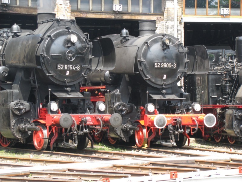 Dampflokomotiven BR 52 8154-8 und BR 52 9900-3 der DR auf der Drehscheibe des ex. Bw Halle P 06.07.2008