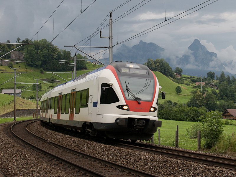 Während auf den Zügen des Grundtaktes ein einzelner Komet viel zu klein wäre, ist dies auf einem Halbstundenzug Visp - Zermatt durchaus zu verantworten: ABDeh 4/8 2011 am 25.7.2009 als R 227 oberhalb Kalpetran.