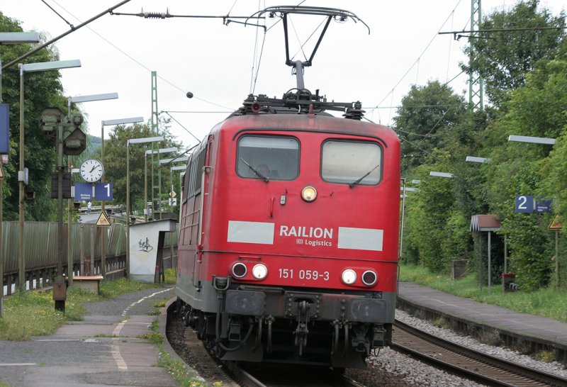 Die 151 059-3 durchfährt Erpel mit einem Güterzug am 16.07.2009