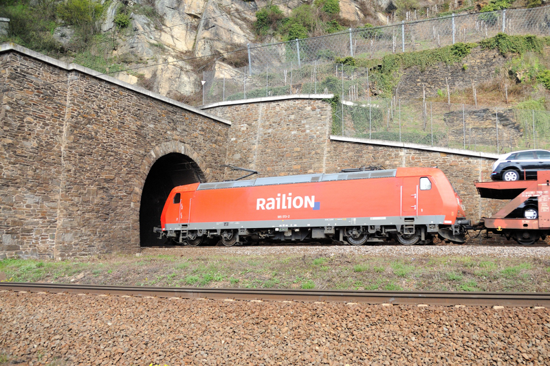 Gleich bin ich weg... (185 173-2 bei Einfahrt in den Loreley-Tunnel, nordwärts, April 2009).
