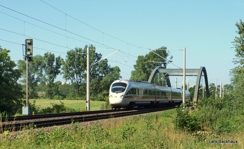 ICE 33 Hamburg Hbf - Kopenhagen passiert am 16.07.09 das Überführungsbauwerk über die Bundesstraße 75 bei dem Ort Kneeden zwischen Reinfeld (Holst.) und Bad Oldesloe.