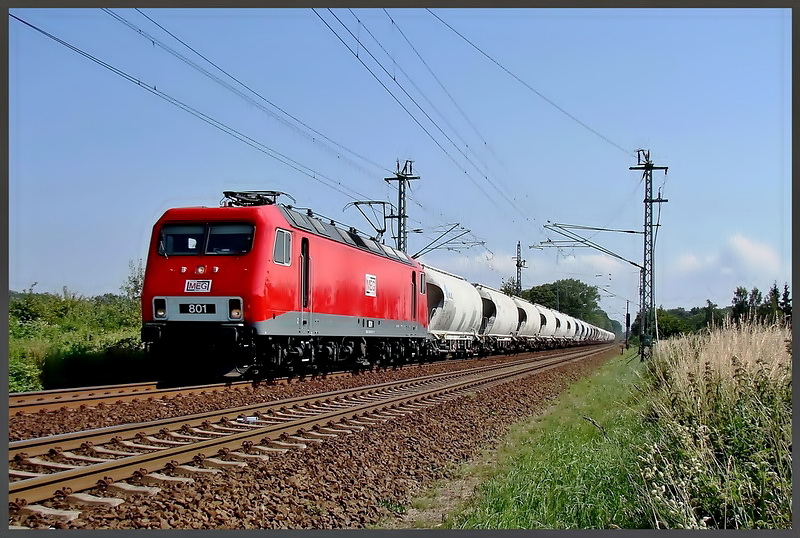 MEG 801 mit einem Zementzugumleiter aus Rüdersdorf kurz vor Stralsund. am 01.07.09