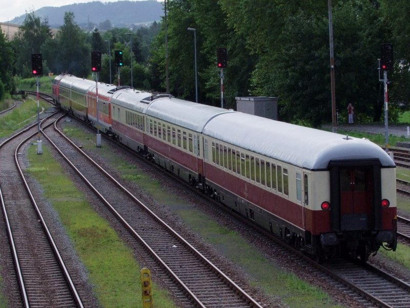 Nachschuß auf D16433, dem 1. Klasse Nostalgiesonderzug TEE Rheingold, welcher leider nicht den angekündigten Aussichtswagen mitführte;(Durchfahrt Ried i.I.) 090725