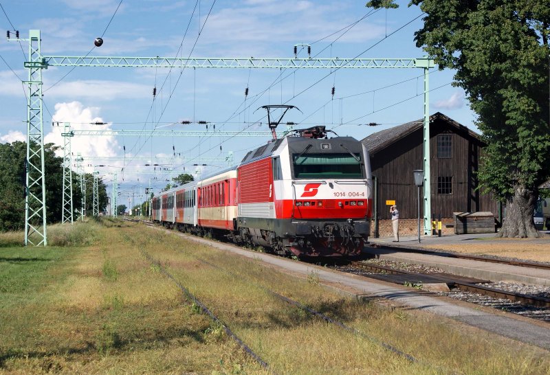 Pünktlich um 17:07 Uhr erreichte 1014 004 am 25.07.2009 mit EZ7933 von Neusiedl am See den Zugendbahnhof Pamhagen.