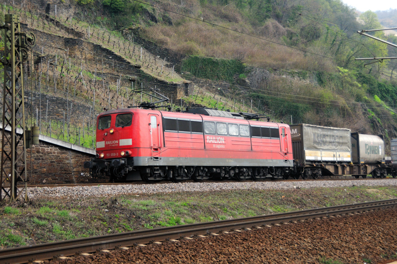 Samstäglicher Güterverkehr auf der rechten Rheinseite: 151 059-3 zieht einen Klv-Zug nordwärts, kurz vor dem Loreley-Tunnel. (April 2009).