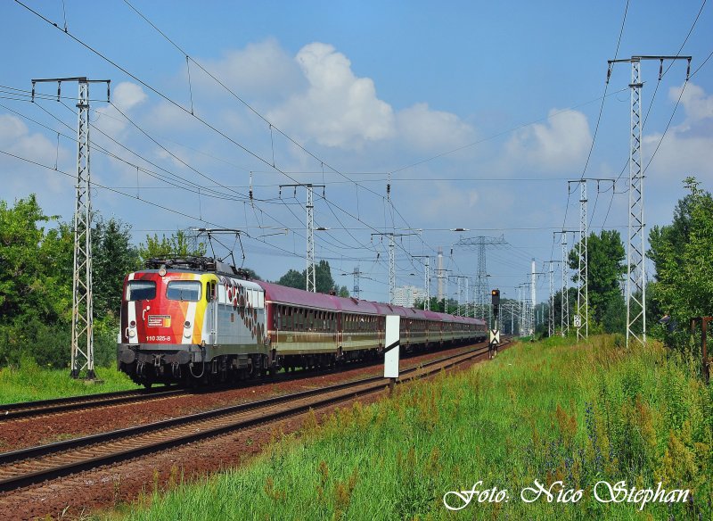 Wissenschaftlok 110 325-8 durchfährt mit einem Sonderzug nach Berlin-Ostbahnhof,die Berliner Wuhlheide (03.07.09)