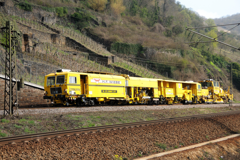 Zwei Gleisbaumaschinen der Fa. H.F. Wiebe streben auf der rechten Rheinseite Koblenz entgegen. (April 2009, kurz vor dem Loreley-Tunnel).