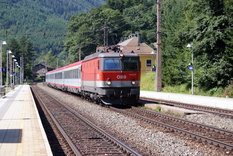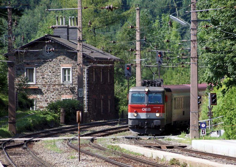 1044 050 mit IC534 "Österreichischer Städtebund" von Lienz nach Wien Süd, bei der Einfahrt in den Bahnhof Breitenstein, 30.07.2009.
