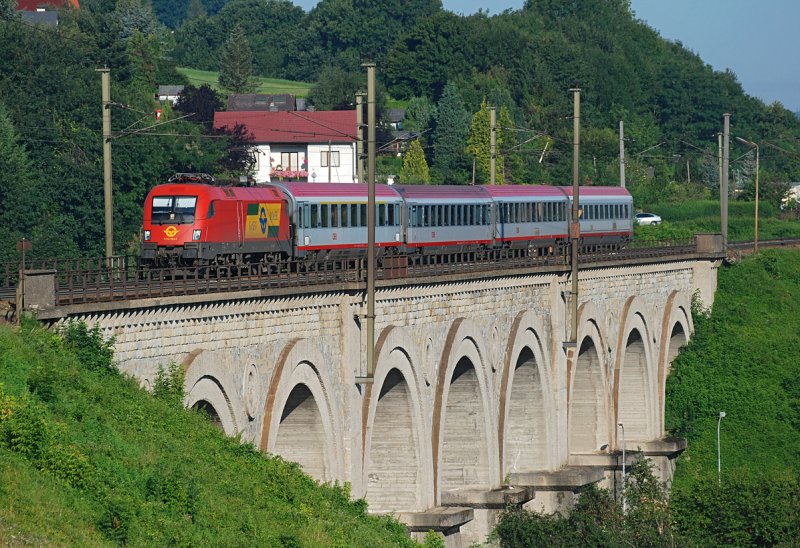 1116 063 um 07:55 am Viadukt in Neulengbach, vermutlich mit ÖBB Eurocity 767 von Salzburg nach Wien Westbahnhof. Die Aufnahme entstand am 30.07.2009.