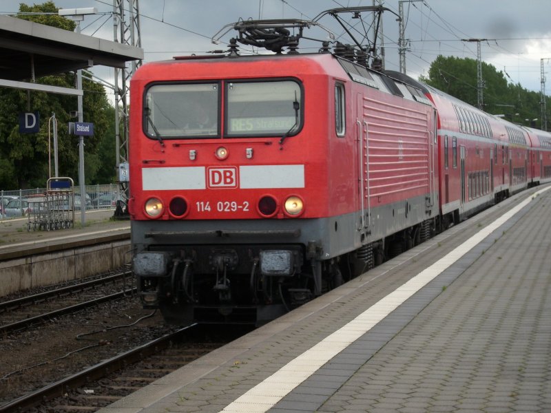 114 029 am 25.Juli 2009 bei der Einfahrt in Stralsund mit dem Regionalexpress aus Falkenberg/Elster.
