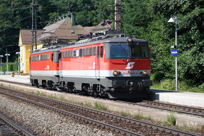 1142 643 und 1142 654 fahren als Lokzug nach Gloggnitz retour um wieder als Vorspannloks über dem Semmering eingesetzt zu werden. Breitenstein, 30.07.2009