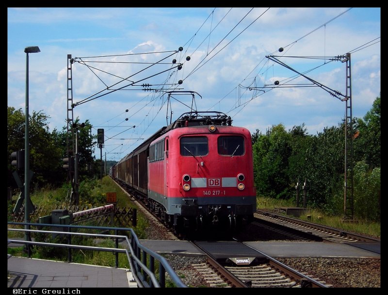 Und 140 013-4 mit sauber gemachter Nummer durchfährt Erkelenz mit einem gemischten Güterzug, die andere Seite der 140er ist mit Einfachlampen ausgerüstet, aufgenommen am 23.07.2009