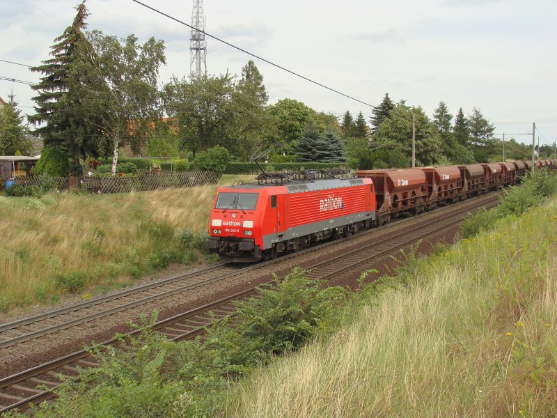 189 046-6 fährt mit einem Ganzzug Schüttgutwagen in Richtung Braunschweig. Fotografiert am 30.07.2009 am Stadtrand von Magdeburg.