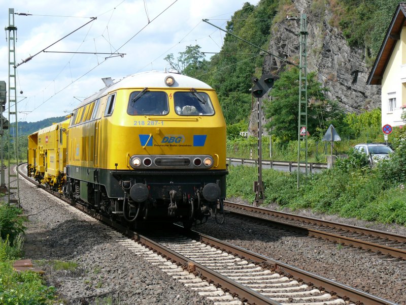 218 287-1 der Deutsche Bahn Gleisbau (DBG) durchfährt mit einem Bauzug Leubsdorf in Richtung Süden. Aufgenommen am 30/07/2009