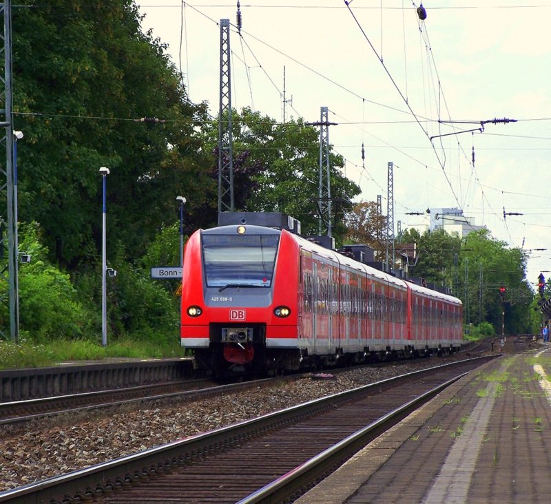 425 038/538 verlässt gemeinsam mit 425 092/592 als RE8 (11323) den Bahnhof Bonn-Beuel in Richtung Koblenz Hbf am 28.07.09