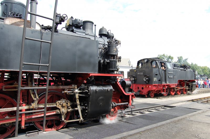 99 2321 steht abfahrbereit neben der kalt abgestellten 99 332.