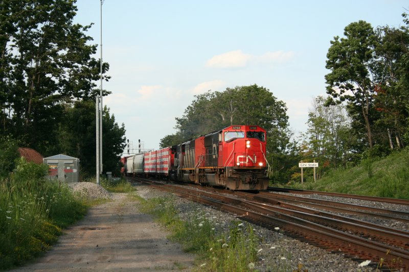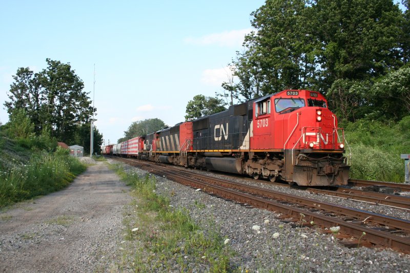 CN SD75I Class GF-643 5703, CN EF-638b 5525 und GF-430a 9449 vor Güterzug bei Hamilton,ON am 28.7.2009.