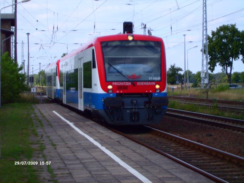Die Prignitzer Eisenbahn am 29.07.2009 mit dem VT 650 bei der Einfahrt in den Bahnhof Nassenheide auf der Linie RB 12 nach Berlin-Lichtenberg