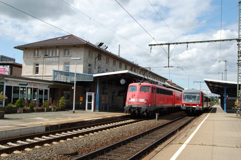 Eine Einheitslokomotive trifft auf einen Dieseltriebzug. Am 25.7.2009 trifft 110 446-2 in Aalen auf 629 340-1, welcher auf Abfahrt wartet.