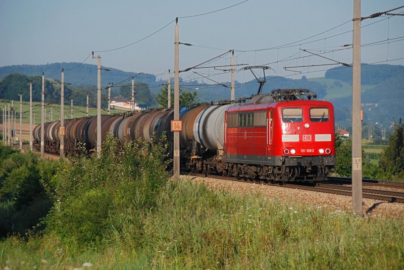 Im schönsten Morgenlicht präsentierte sich am 30.07.2009 die DB 151 168 mit ihrem Kesselwagenzug kurz vor Neulengbach.